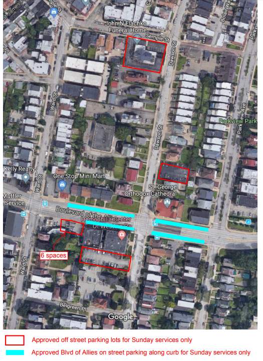 Parking for the church services on Sundays is permitted in the areas boxed in red on the map below.
